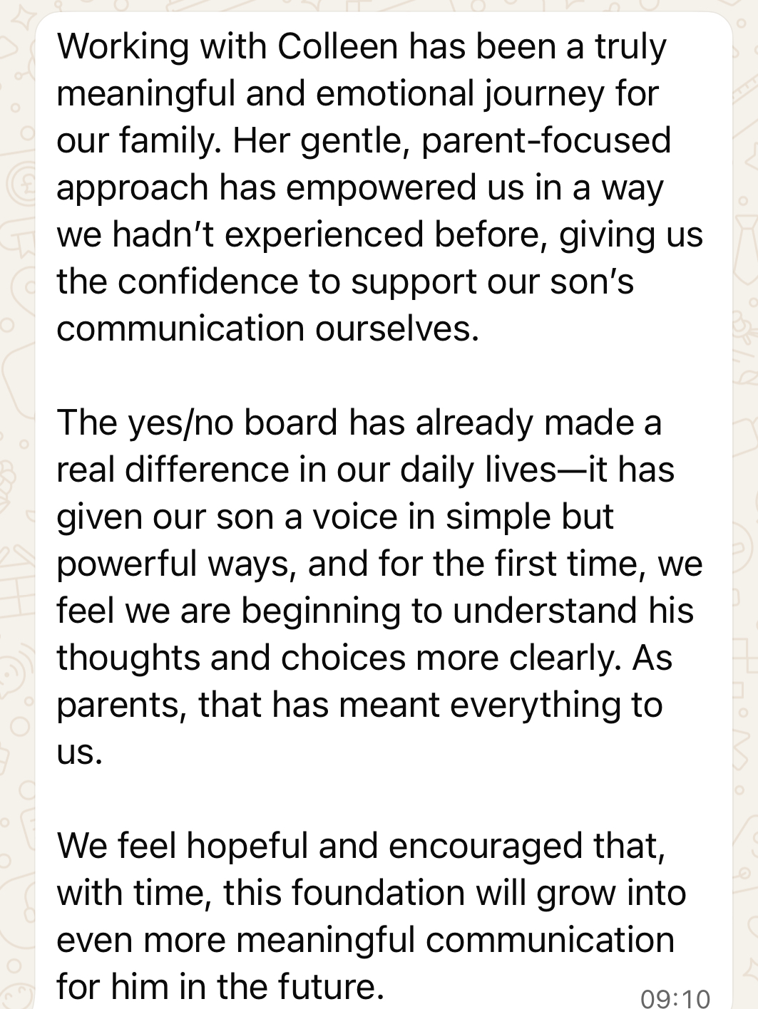Nous avons essayé la communication par pression négative (PECS), un dispositif de communication alternative et augmentée (CAA) et maintenant l'orthographe. Nous n'en revenions pas des mots qu'elle a épelés dès le premier jour ! Nous ne savions même pas qu'elle connaissait l'alphabet avant, sans parler du nombre de mots qu'elle avait en tête. Maintenant, elle apprend à épeler des histoires. Cette semaine, c'était la deuxième. Dire que nous étions émerveillés est un euphémisme. Cela permet à notre fille de commencer à nous montrer sa personnalité et ses centres d'intérêt. Son intelligence est remarquable et savoir qu'elle pourra peut-être enfin s'exprimer est tout simplement incroyable. Le travail de Colleen avec Molly, mon mari et moi a été inestimable. Récemment, elle a collaboré avec l'un des thérapeutes de Molly, ce qui leur a également permis de mieux comprendre ses capacités. Un grand merci à